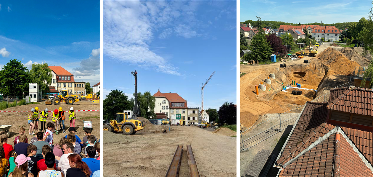 Spatenstich und Baugrube für den Erweiterungsbau und die neue Sporthalle am Evangelischen Gymnasium Lernwelten in Großdeuben.