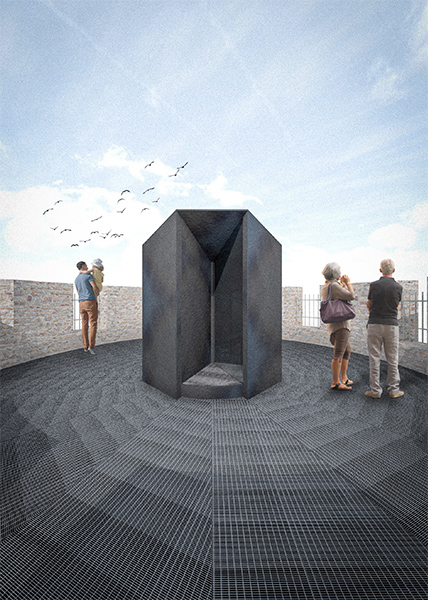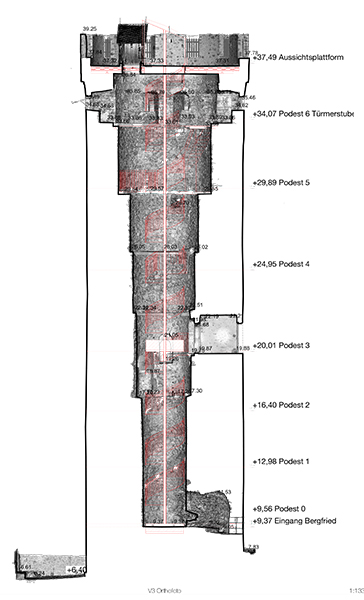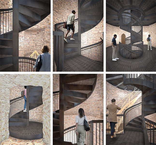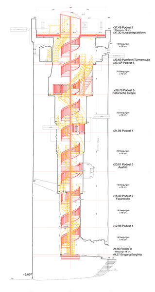 Die historische Holzkonstruktion der Treppe wird durch einen stählernen Einbau ersetzt, der einen bewussten Kontrast zu den romanischen Umfassungsmauern des Bergfrieds bildet und durch podestartige Aufweitungen mit der sich aufweitenden Grundgeometrie des Bestands spielt. Die Spindeltreppe mündet in einem zentral gelegenen Dachausstieg, durch den die neu aufgesetzte Aussichtsplattform angebunden wird.