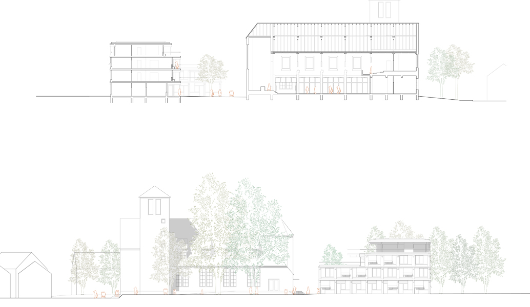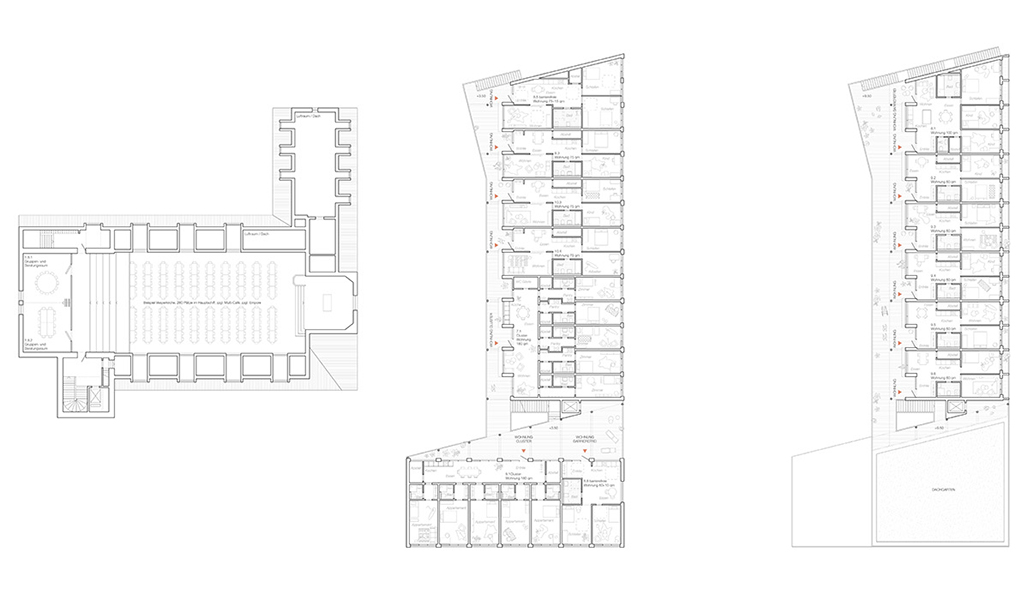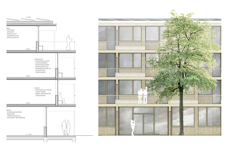Der Neubau spannt mit der Kirche gemeinsam einen Quartiershof auf. Der Wohnungsmix aus insgesamt 21 Wohnungen wird als einfacher Holz-Hybridbau konzipiert. Die durch die Nutzung angestrebte soziokulturelle Nachhaltigkeit wird auch baulich manifestiert, der Neubau steht sinnbildlich für einen sorgsamen und verantwortungsvollen Umgang mit der Schöpfung.