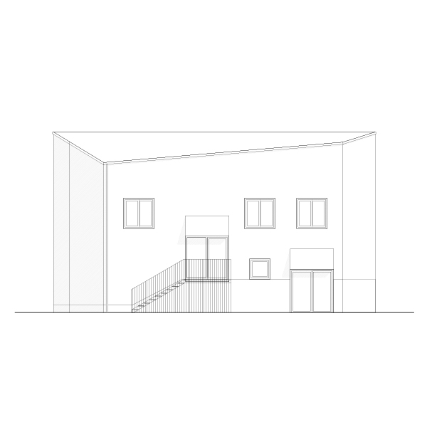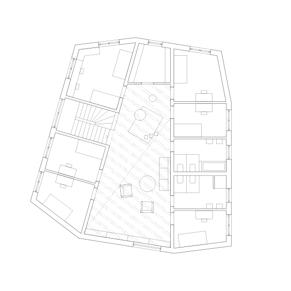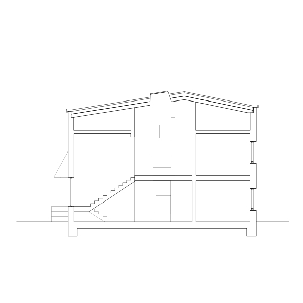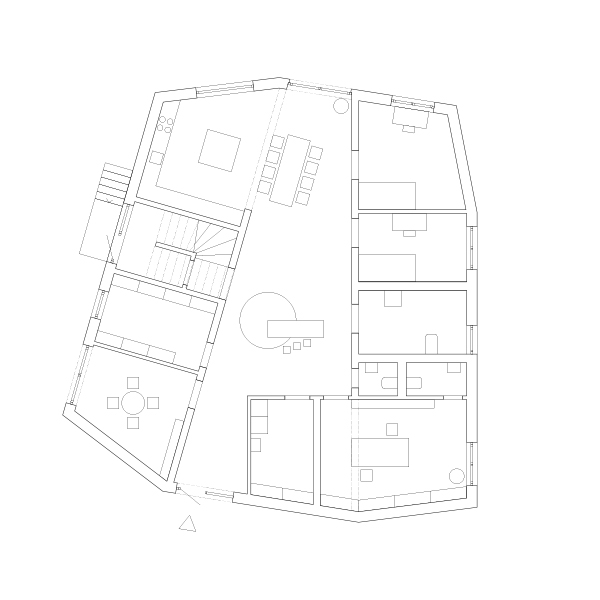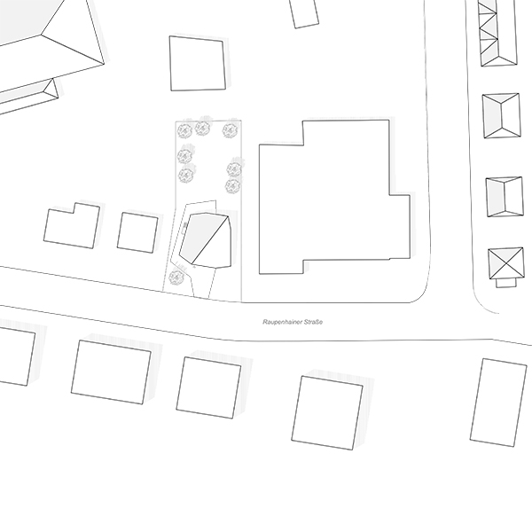 Der polygonale, zweigeschossige Baukörper mit einem leicht geneigten Satteldach interpretiert die Vorgaben des Bebauungsplans und setzt sich damit bewusst von der Nachbarbebauung ab. Das Haus erhält eine eigenständige Gestaltung mit hohem Identifikations- und Wiedererkennungswert.