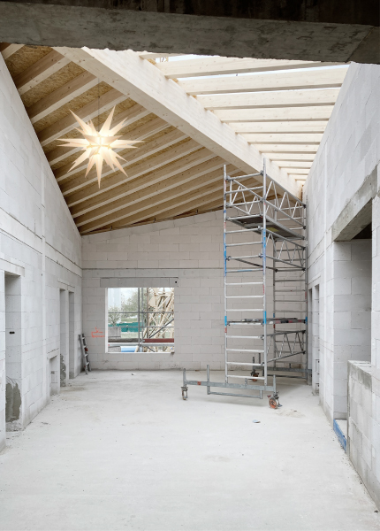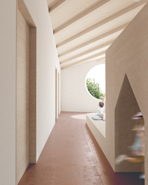 Das Erdgeschoss nimmt neben dem Personal- und Elternbereich im Wesentlichen einen großen Gemeinschaftsbereich mit Küche auf. Das Obergeschoss ist den Kinderzimmern vorbehalten, die um eine gemeinsame Spielmitte herum gelagert sind. Das Projekt wurde 2023 fertiggestellt.