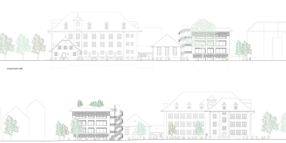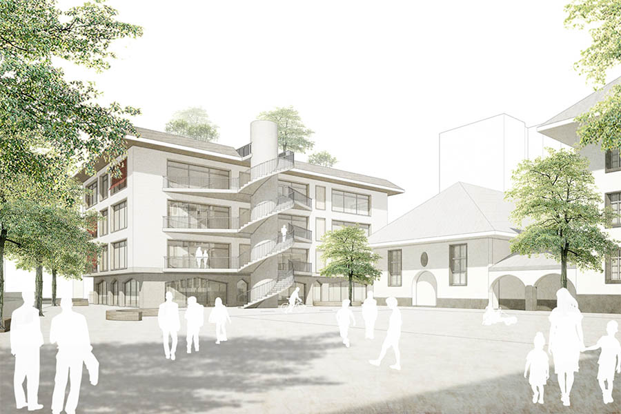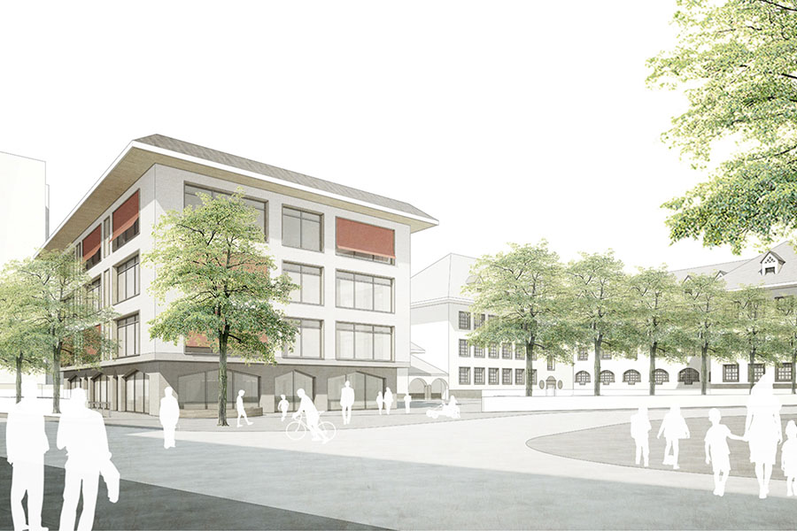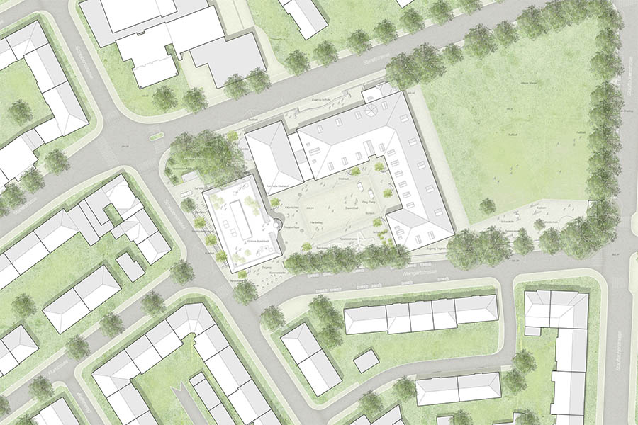Der Erweiterungsneubau wird als viergeschossiger, rechteckiger Baukörper orthogonal zur bestehenden Anlage positioniert. Dadurch wird die Zugehörigkeit des Neubaus zur restlichen Schulanlage manifestiert und die übergeordnete Inselartigkeit der gesamten Parzelle im städtebaulichen Kontext betont.