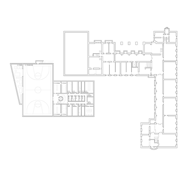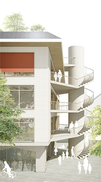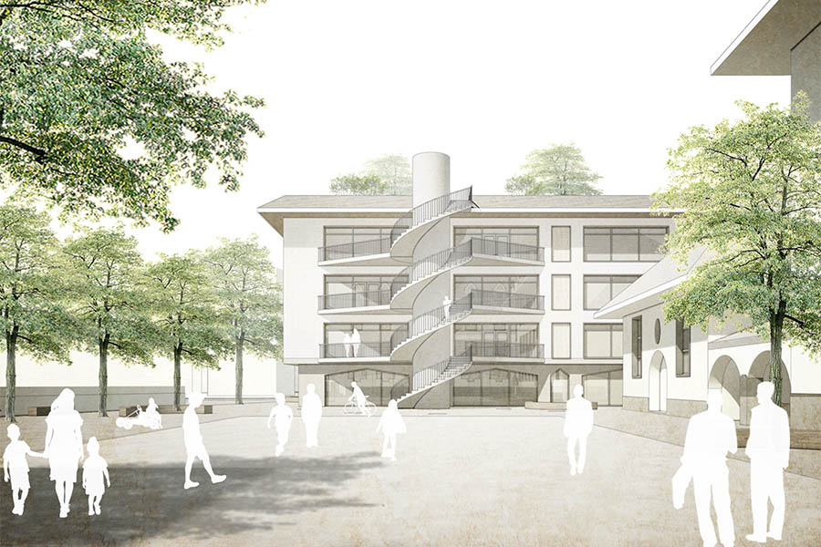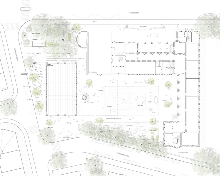Der Fußabdruck des Neubaus wird durch die Größe der halb eingegrabenen Sporthalle bestimmt. Die Erschließung der darüber liegenden Schul- und Aufenthaltsräume erfolgt über einen skulpturalen, außenliegenden Treppenturm auf der Ostseite. Dieser Turm verankert den Neubau auf dem Schulhof und bildet das fehlende Gegenstück zum Kopfbau des Bestands. Der Schulhof wird über die Treppenskulptur mit dem Spielgarten auf der Dachterrasse verbunden.