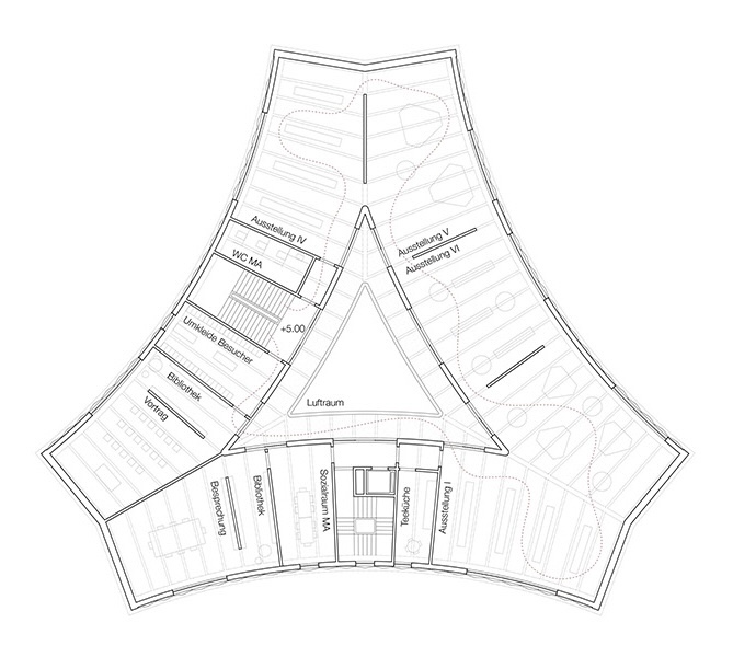 Der viergeschossige, signifikante Baukörper definiert den zentralen Ankommensort auf der Wasserkuppe. Seine sechseckige, wankelartige Grundform nimmt Bezug auf die Struktur historischer Nurflügel-Segelflugzeuge und überträgt deren konstruktive Logik in eine raumprägende, architektonische Figur.