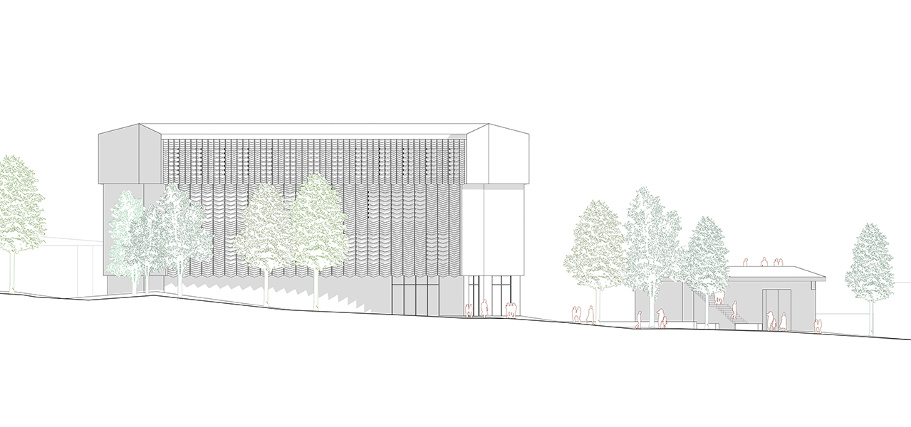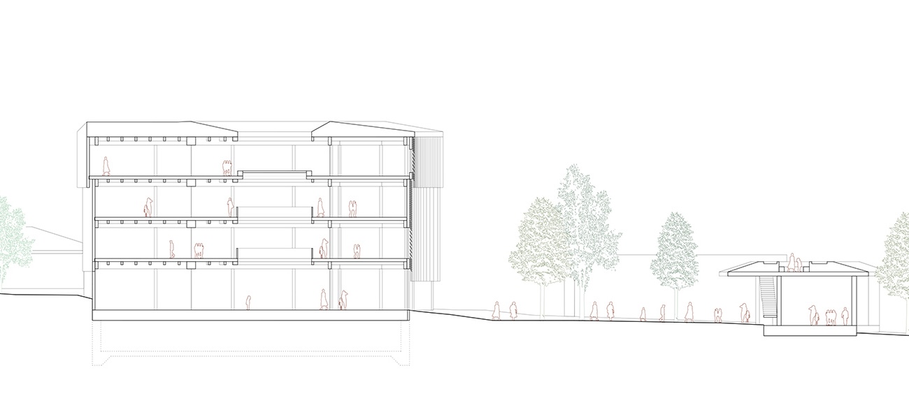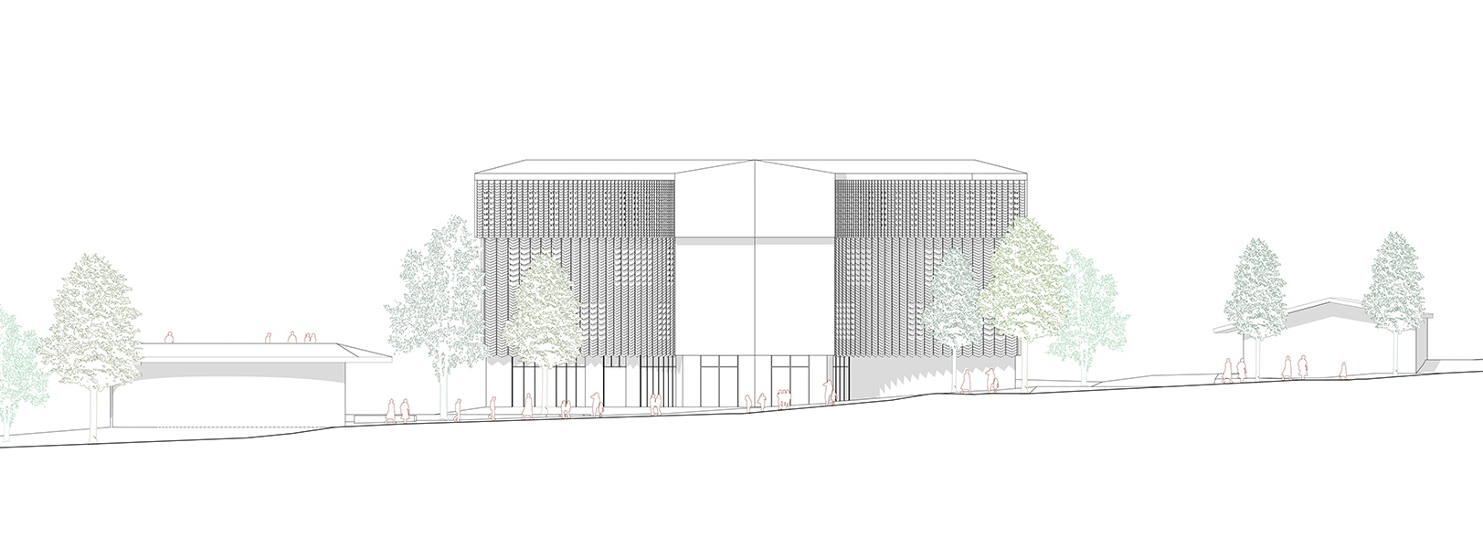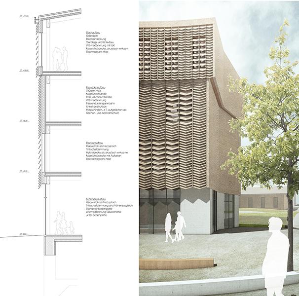 Der Neubau wird als Holz-Beton-Hybrid konzipiert und öffnet sich über ein zentrales Foyer zur Landschaft hin. Eine Schindelfassade aus regionalem Holz greift die Bauweise der Rhön auf. Die Freiraumgestaltung bindet das Gebäude mit einem großzügigen Ankunftsplatz und fließenden Übergängen in die umgebende Topografie ein.